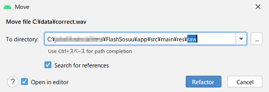 「raw フォルダに移動」してしまった場合は、エクスプローラーでプロジェクトを作成したフォルダを探し、 app、src、main、res、そして raw とフォルダを追っていきます。 するとそこに「移動された」音声データファイルがありますから、元の場所にコピーして取り戻しておきましょう。