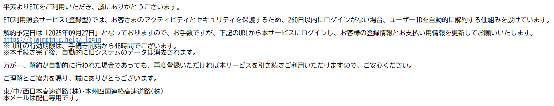 今回連続して ETC 解約に関するメールが届いているのですが、少し気になる届き方でしたので、紹介します。