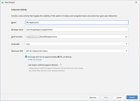 希望の設定ができたら、右下の「Finish」をクリックします。 改めて、Package name の欄ですが、テスト目的だけであれば com.example のままでよく、 書き換える場合は既存のアプリとの重複を避け、他人の権利を侵害しないよう、責任ある独自の文字列にする必要があります。