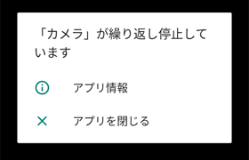 すると、カメラアプリが動作を停止し、ホーム画面に戻ってしまいました。 何度起動しても、変わりません。 Android 9.0 がリリースされて半年以上経過しているはずなのですが、システム系のアプリでエラーがでるとは・・・。