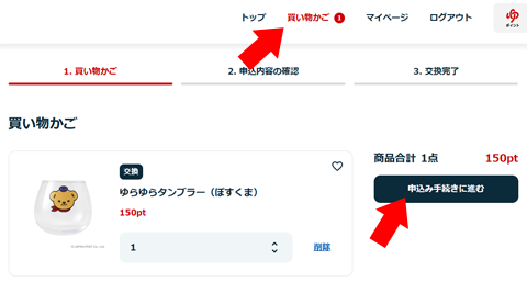 アイテムと数量、利用ポイントを確認して「申込み手続きに進む」をクリックします。 数量はこの画面でも指定・変更できるようです。