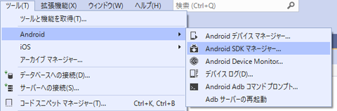 Windows の再起動を促されるので再起動し、 VS 2019 を起動すると、「ツール」メニューに「Android」グループが加わりました。